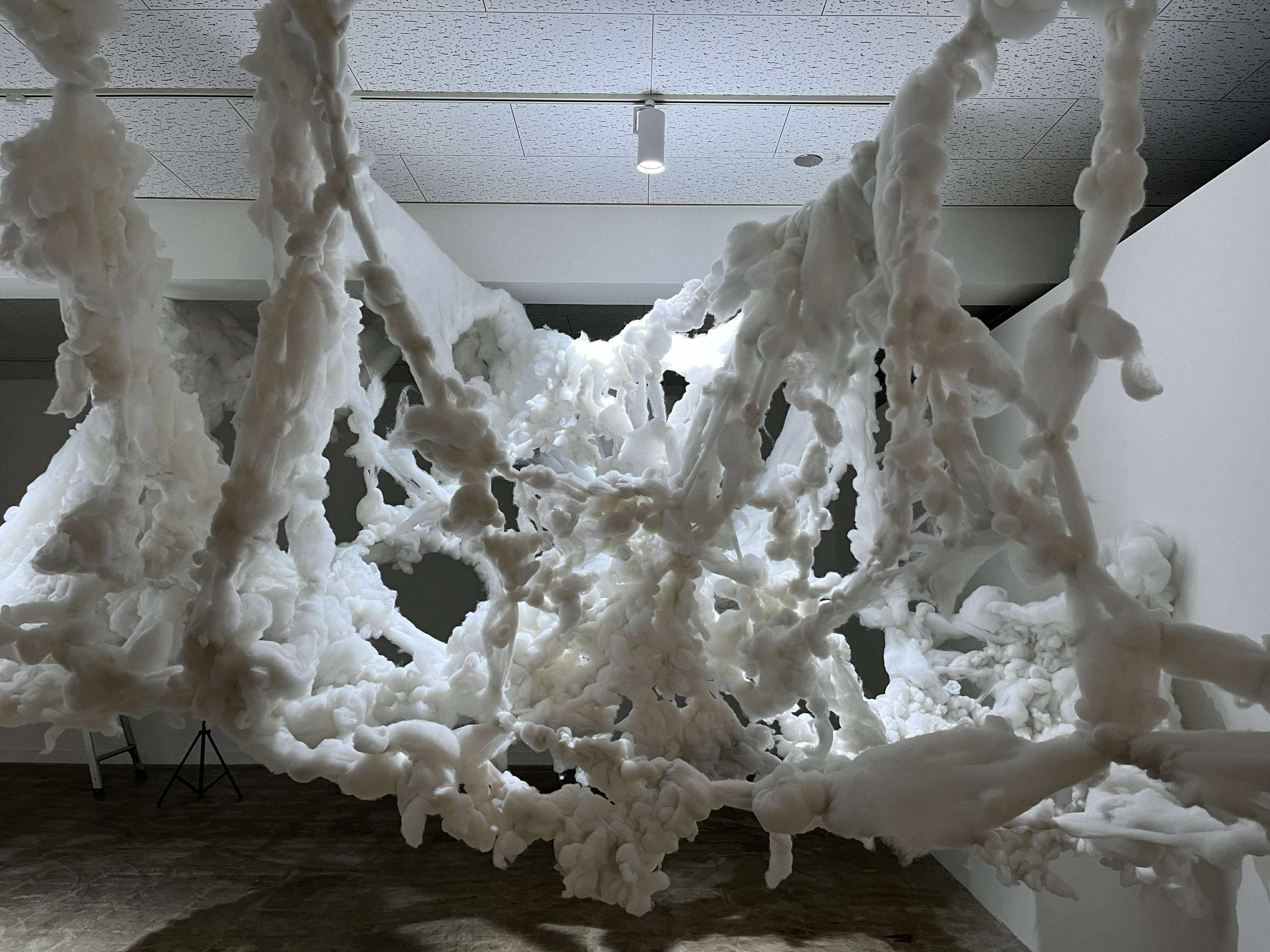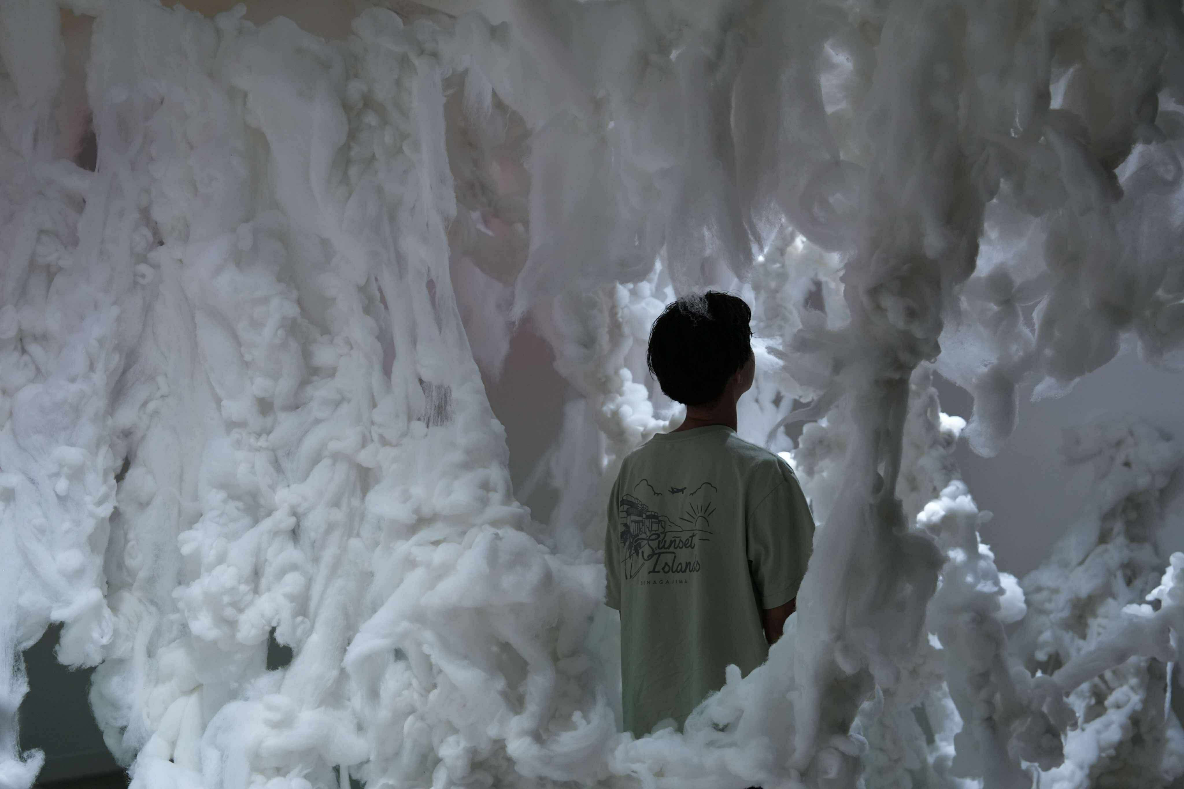 本展「生き纏う|循環」は、2024年に横浜で開催した展示「生き纏う」で使用された綿(わた)という素材を再構築し、その身体的記憶や触れ合いの痕跡を宿したまま、福岡という新たな地に呼び戻す試みです。綿は曖昧さや柔らかさ、崩れやすさを持ち、感情や関係性と重なる素材です。人々に触れられ、纏われ、剥がされていった綿たちは、記憶を内包した存在として、今回あらためて空間に配置されます。本展では「素材=記憶=関係性」と捉え、触れた痕跡を編集しなおすことで、空間がいかに“生き心地”を持つのかを問い直します。触れることや触れられることを起点に、曖昧なまま生きることの可能性を探る体感型インスタレーション作品となっております。