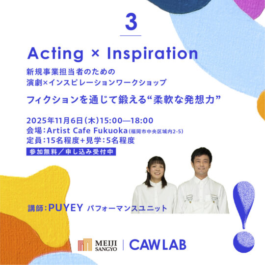 | 名称 | 新規事業担当者のための 演劇×インスピレーションワークショップ「フィクションを通じて鍛える"柔軟な発想力"」 |
