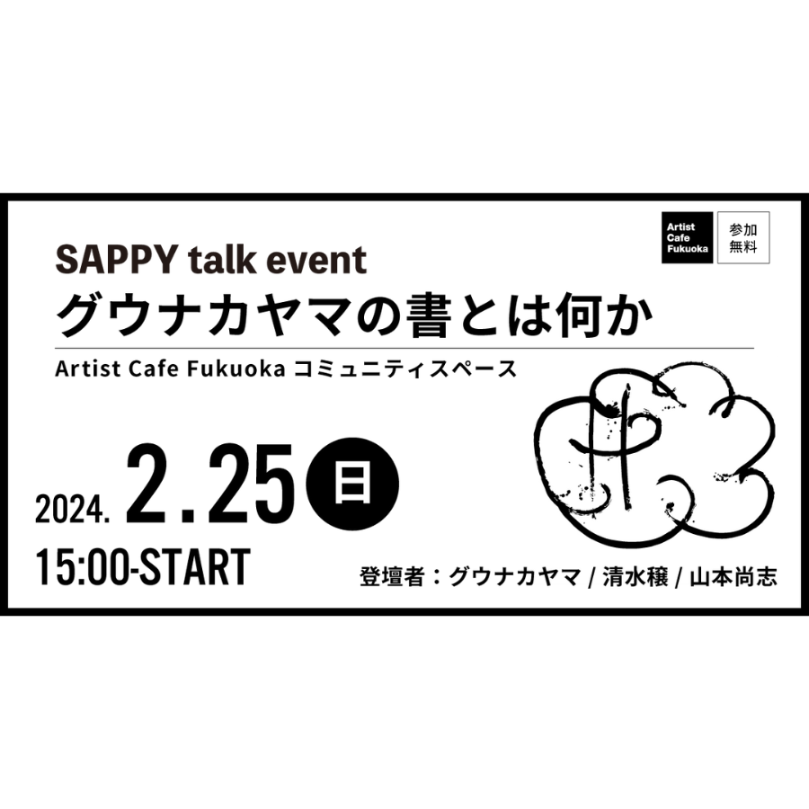 グウナカヤマ個展「SAPPY」開催に際しまして、美術評論家の清水穣、書家・現代アーティストの山本尚志のお二方を招き、作家を交えての鼎談「グウナカヤマの書とは何か」を開催いたします。