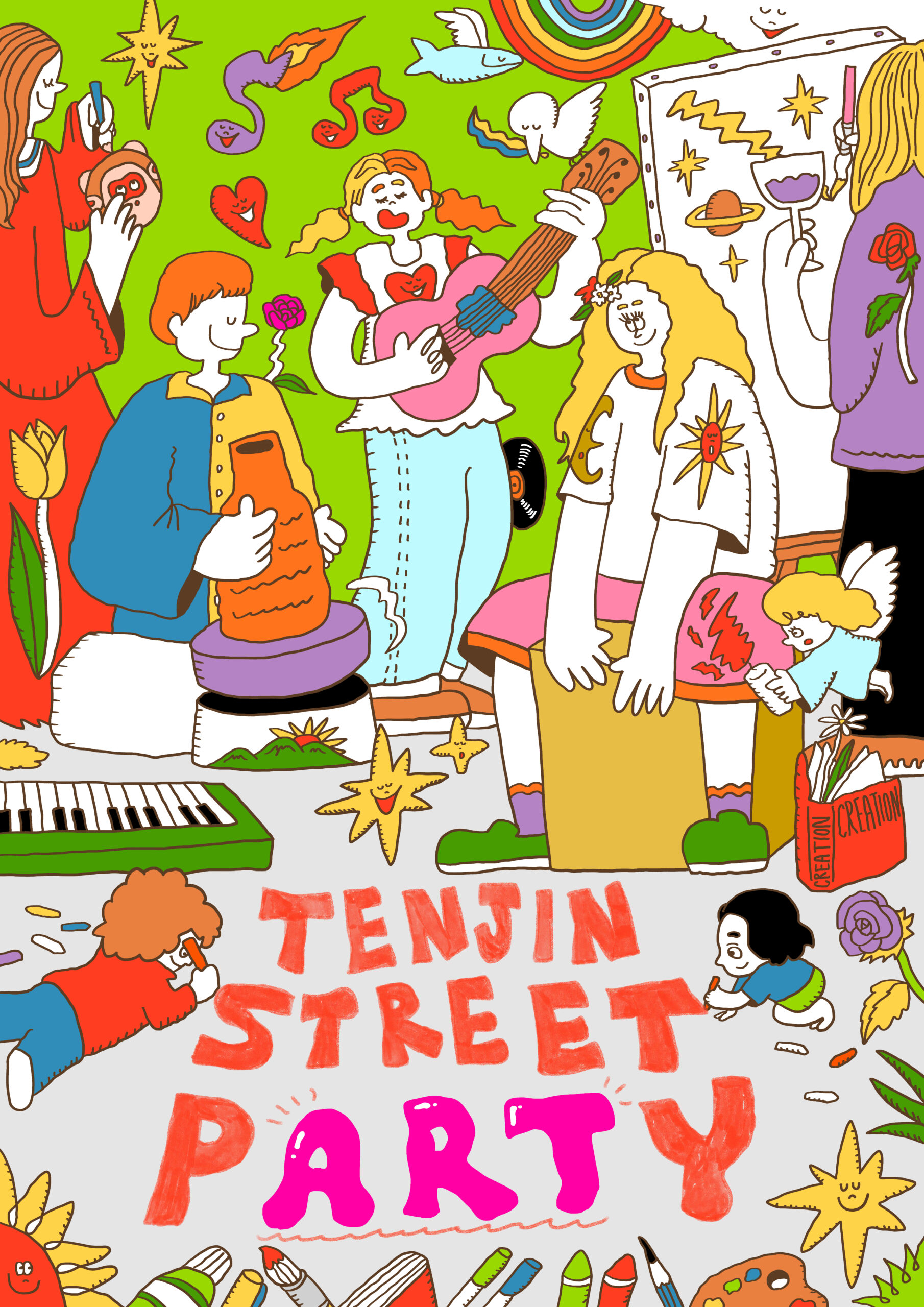 村上さんは、年齢や国籍を問わず幅広く受け入れられる柔らかなタッチの作風で知られ、全方位的に開かれた「天神アートウィーク」の趣旨とも高い親和性があると考えました。アートや音楽、伝統工芸を大人も子どもも分け隔てなく楽しむ風景をイメージし、街全体が自然にアートに包まれるような世界観をビジュアルで表現していただきました。
